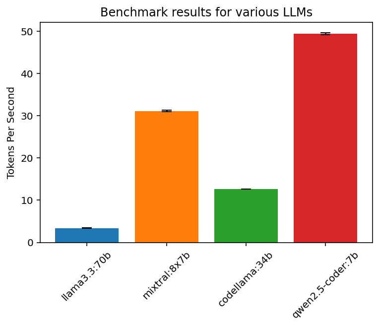 To benchmark the system, a simple token generation test was run on a variety of models with 4 bit quantization. Each model was loaded with the default parameters and given the following prompt: "Write a long essay on the pros and cons of each pizza topping." Responses ranged in the 1000-2000 token range, and each run was repeated 5 times. The token generation results are plotted below with a 95% confidence interval: